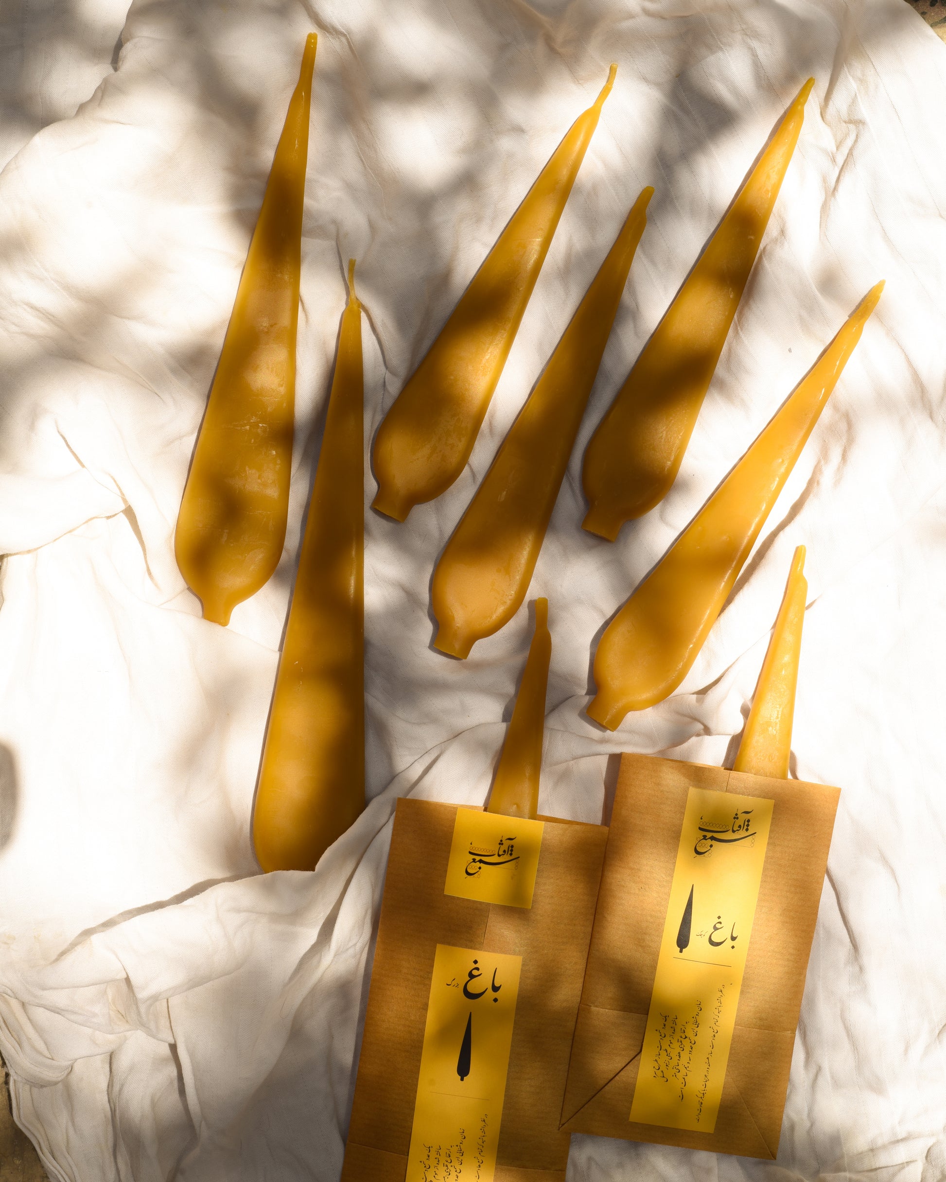 The Baq candle, handcrafted by Aftab, is made from natural beeswax and features an elegant pinecone design. With a burn time of about two hours, it brings a warm, rustic glow to any space. Made from pure beeswax with no harmful additives, it is safe for animals and gentle on the environment.