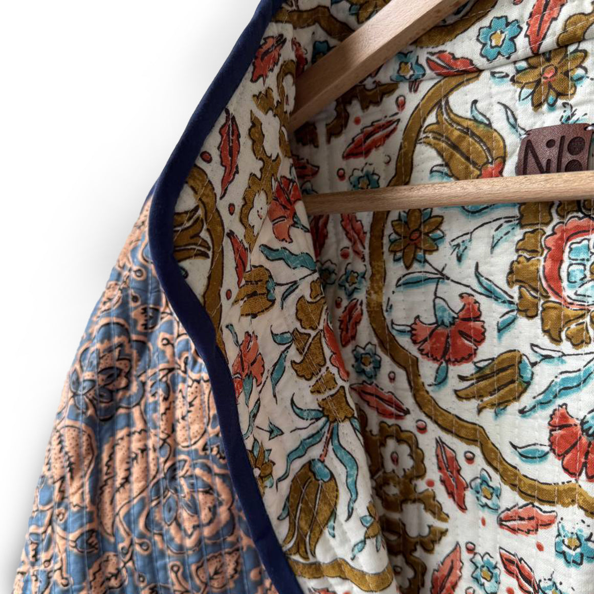 This handcrafted jacket by Niloo features a double-layered design with soft acrylic padding for warmth. This reversible coat has pockets on one side, offering versatile styling in a single piece.