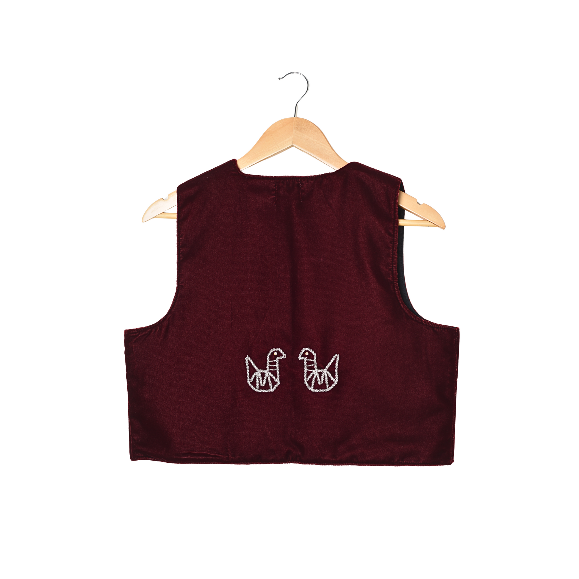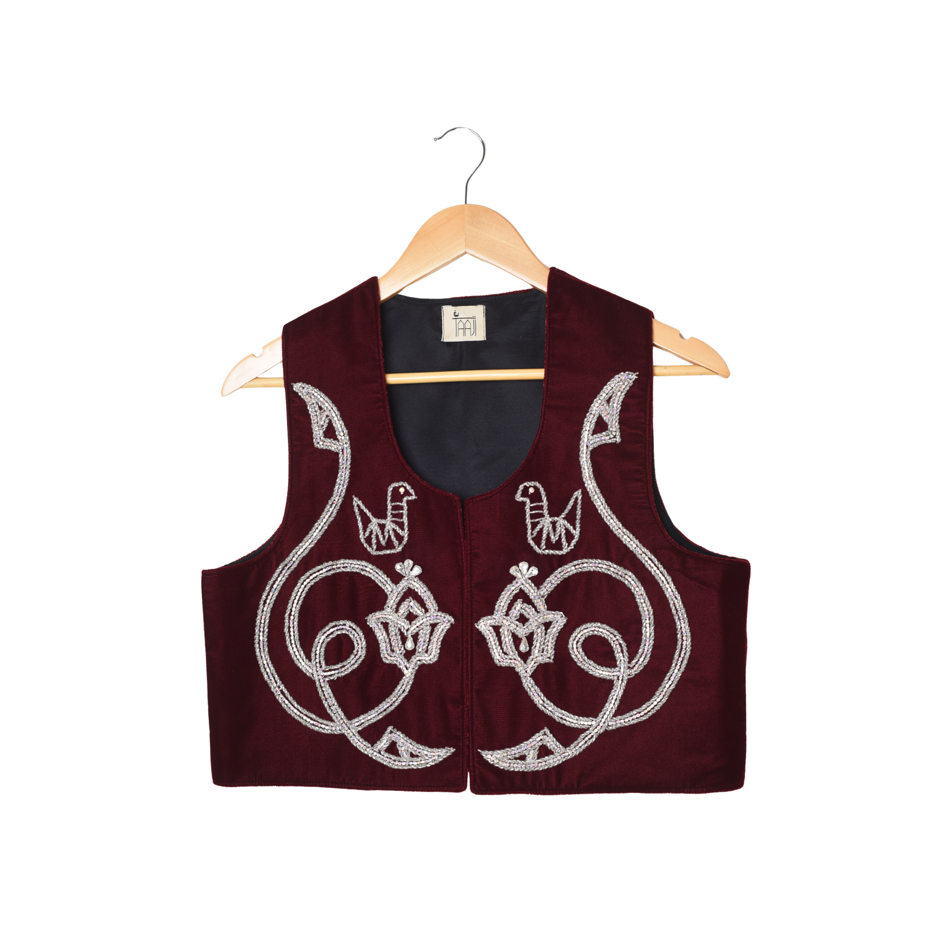 Hand-Embroidered Vest from the Rangin Taj Collection by Taaji. This collection features exquisite hand embroidery crafted by skilled Iranian women artisans, with motifs inspired by the rich artistic heritage of ancient Persian design. Each piece transforms centuries-old cultural narratives into modern, wearable works of art. This vest embodies authenticity, elegance, and timeless beauty, celebrating tradition through contemporary craftsmanship.