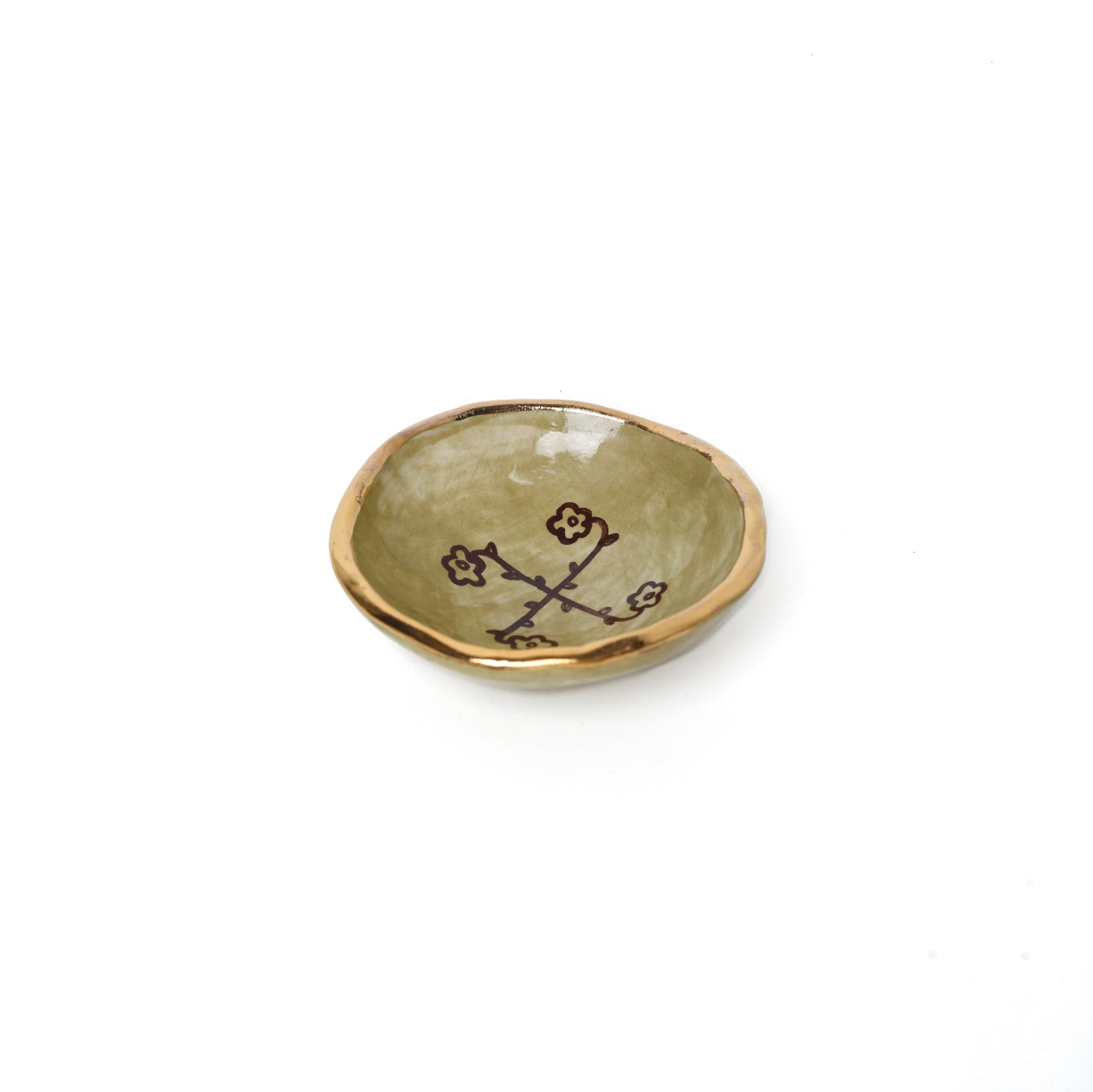 This small, handcrafted green bowl by Tina Ebtehaj, features a delicate gold edge that adds elegance to its unique sophisticated design. The green colored handpainted interior complements the luxurious gold rim, making it a perfect addition to any setting. Ideal for a Haftsin display, small treats, or as a decorative accent, this versatile bowl brings a refined touch to your home décor.
