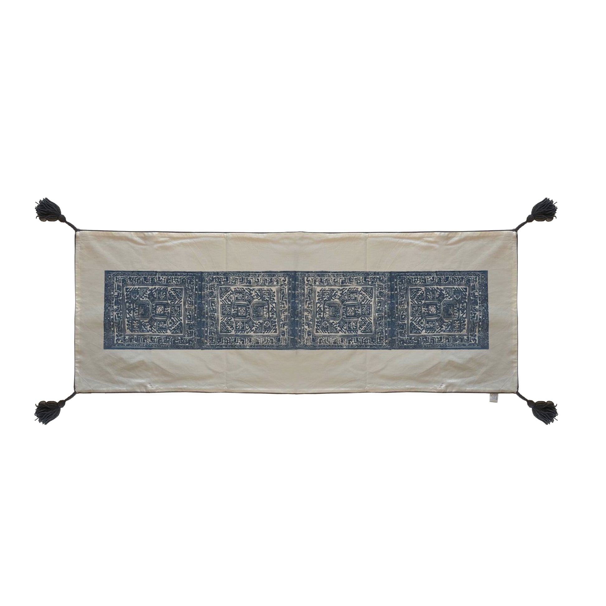 Gereh table runner by Koomeh is a beautifully hand-printed piece, meticulously crafted to add elegance to any setting. It is finished with grey piping along the edges, complemented by matching tassels for a refined, coordinated look. This design seamlessly blends tradition with contemporary style, creating a statement piece that brings both texture and character to the table.