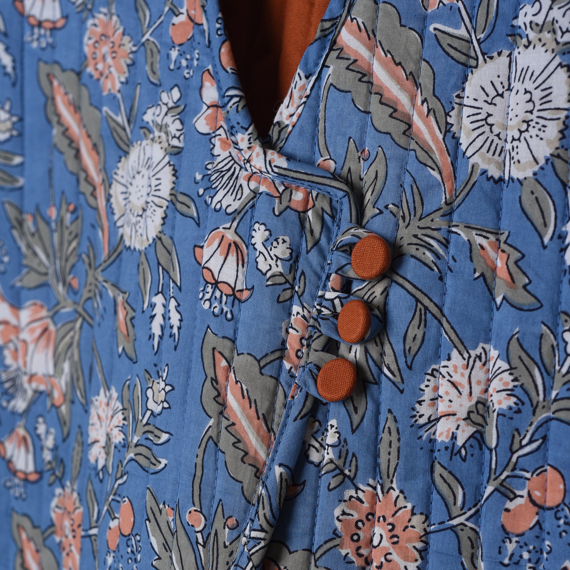 Handcrafted with care by Yaad, this quilted side-tie vest is made from three layers: soft cotton fabric, natural padding, and a beautifully printed textile, all brought together with delicate hand-stitching. Each piece is produced in very limited quantities, giving every vest its own unique character.